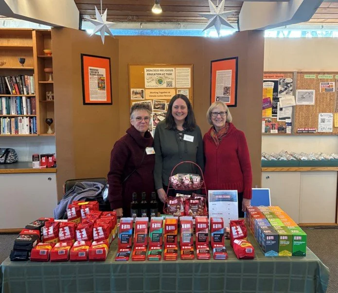 We sell fair trade coffee along with tea, chocolate and nuts monthly to support small farmers and the use of fair-trade coffee at our Sunday coffee hours.